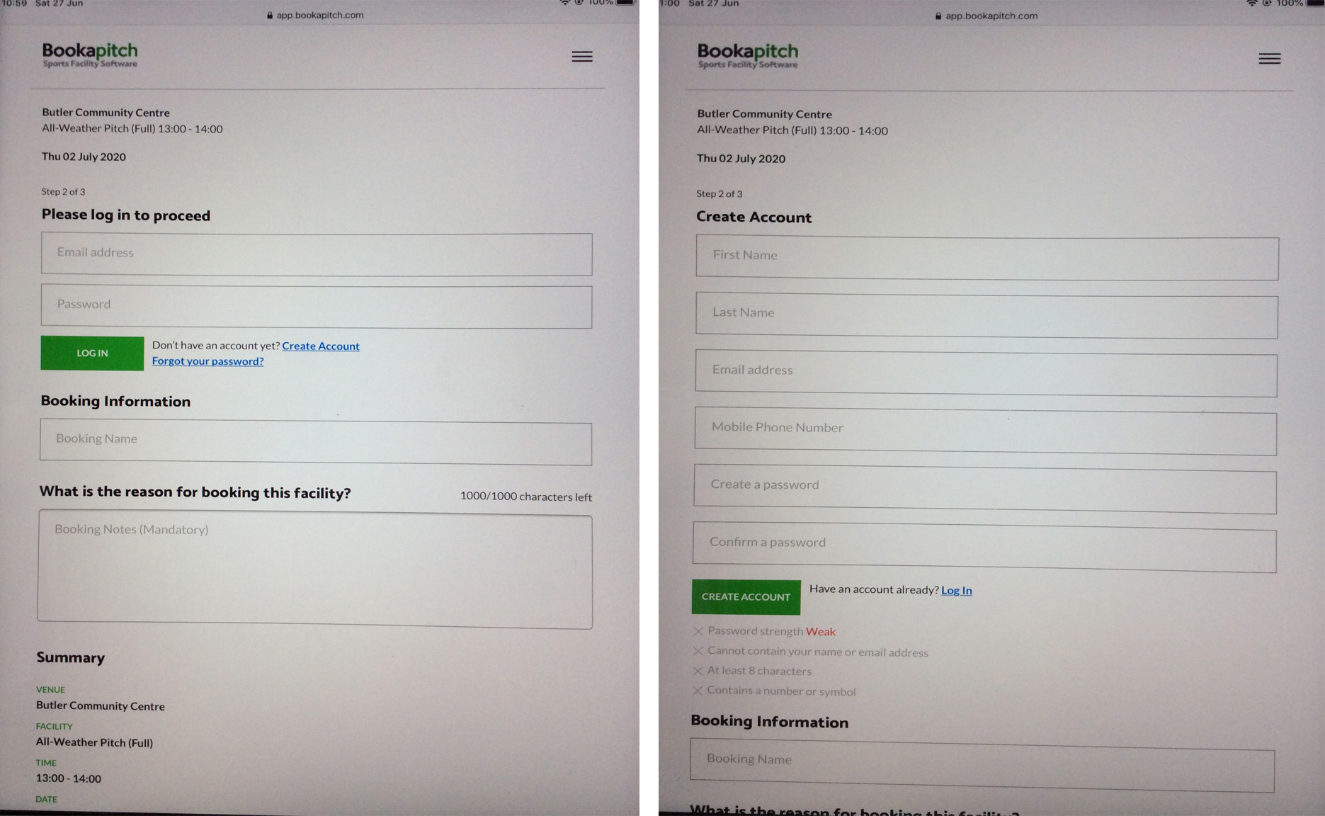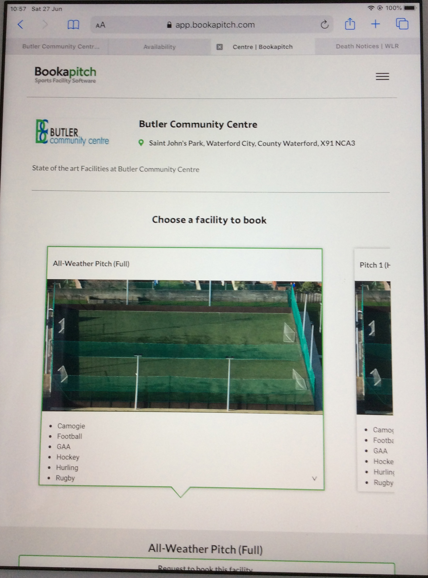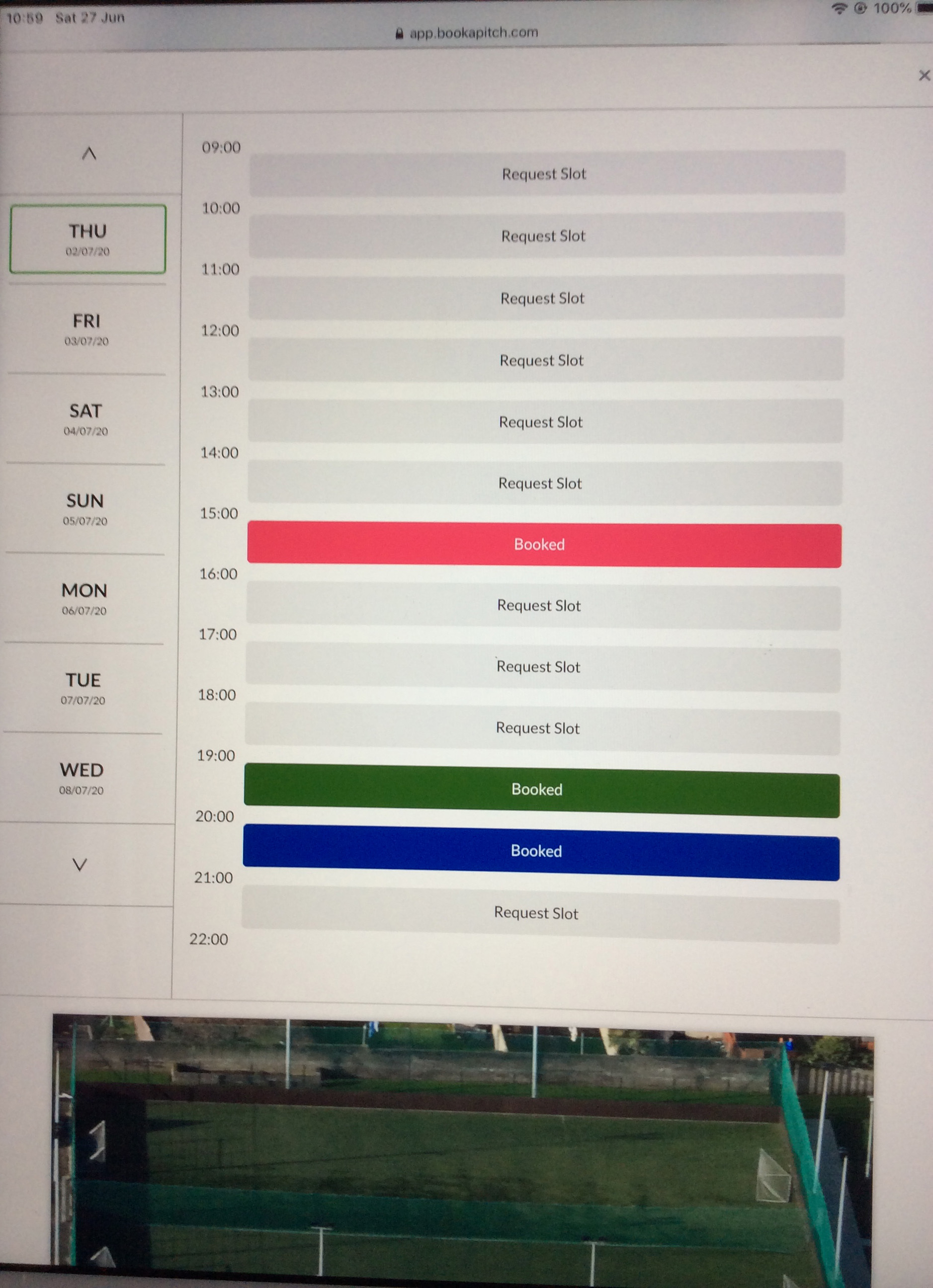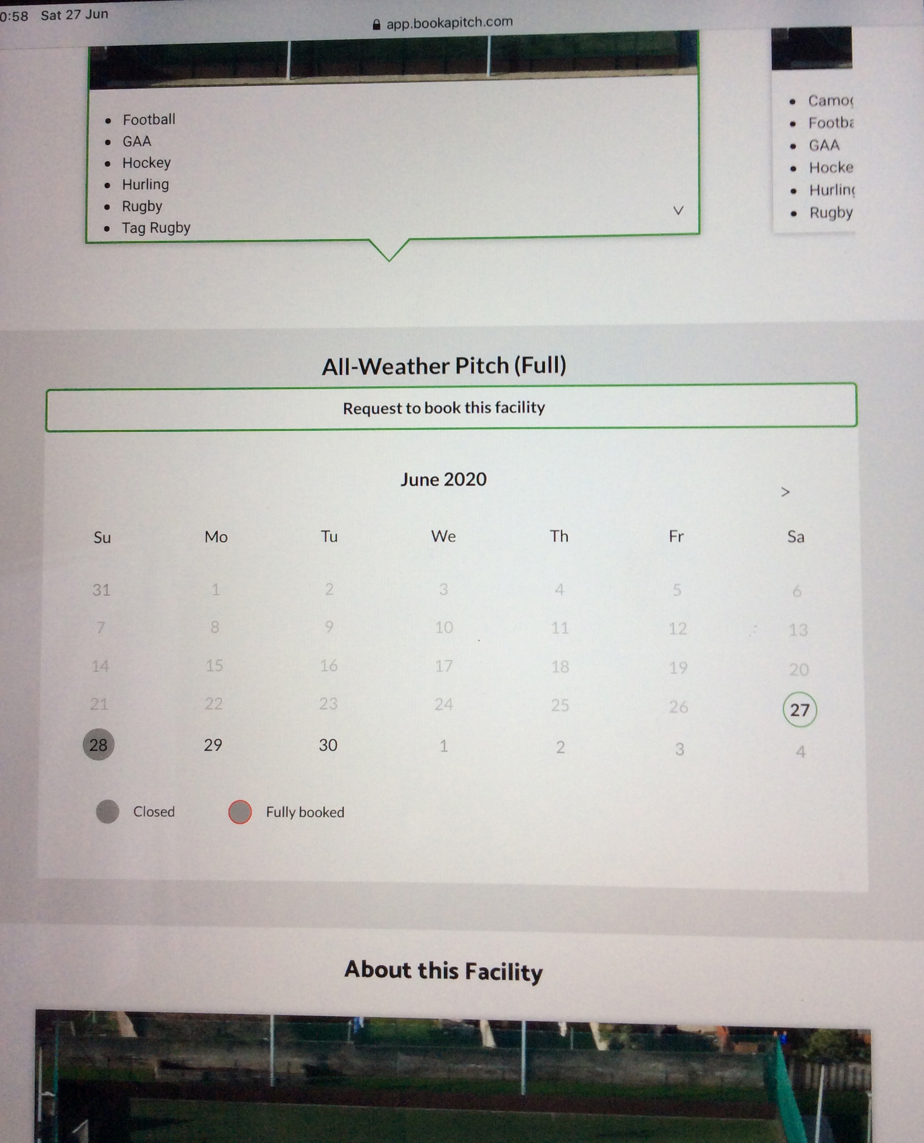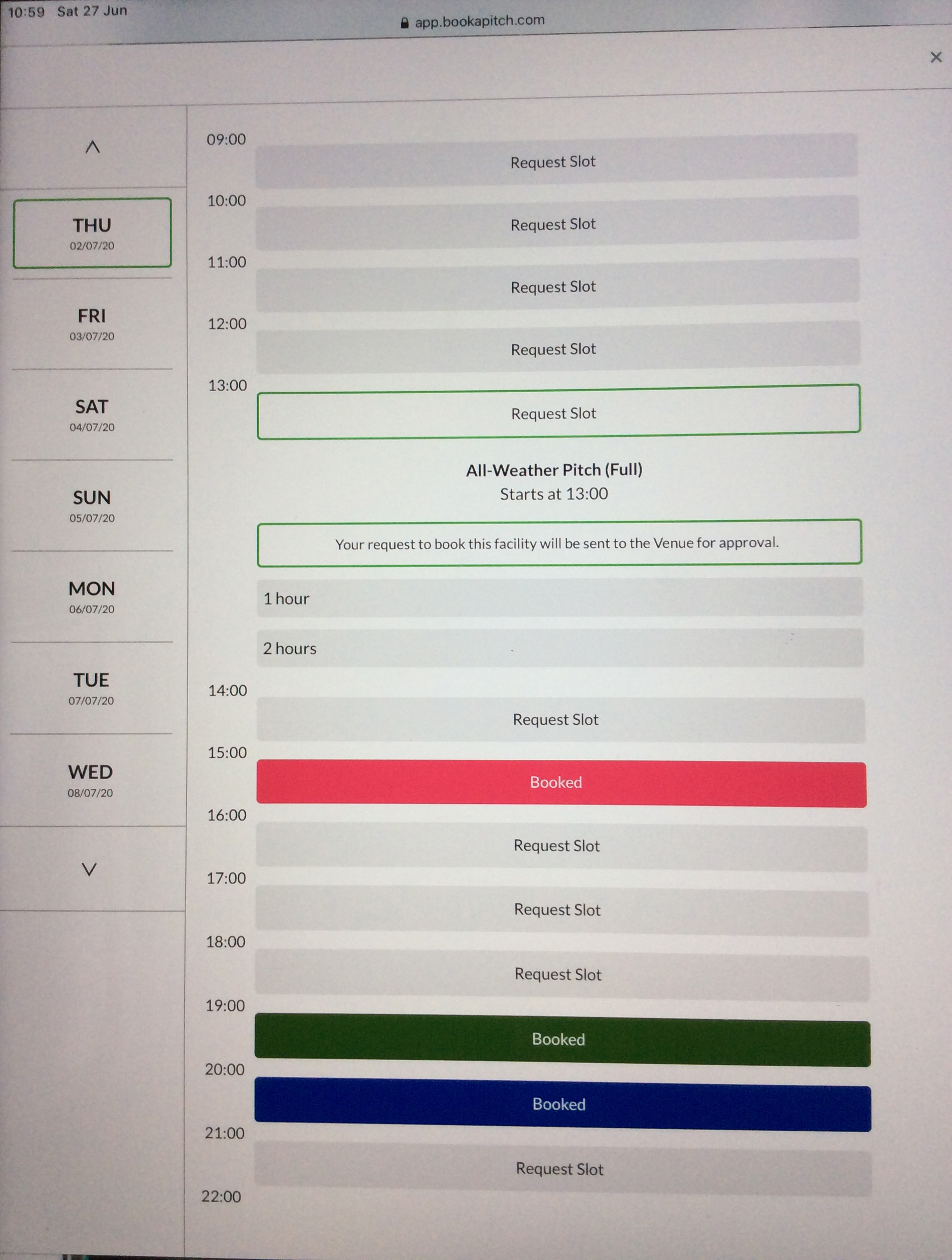 Select Facility option to Request (All-Weather Pitch Full is outlined in green; this is the default option); select your preference. Your selection will display the green outline. Swipe across to view all options.