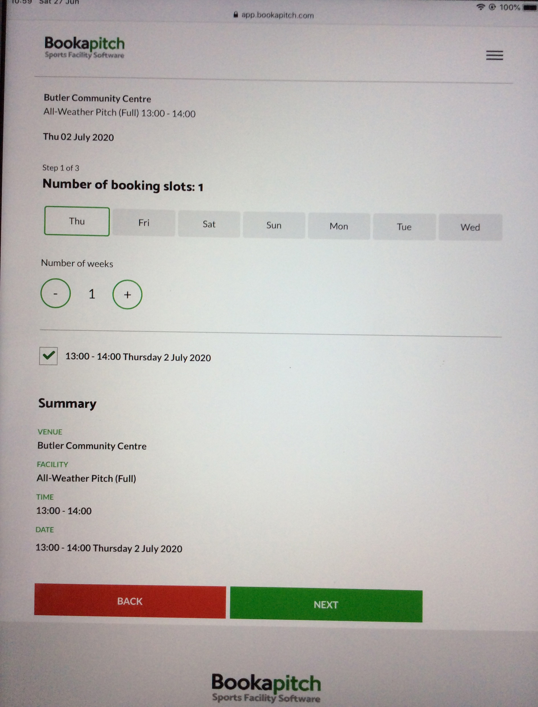 Select the number of weeks required for booking; the same time slot and days will apply to all weeks.
