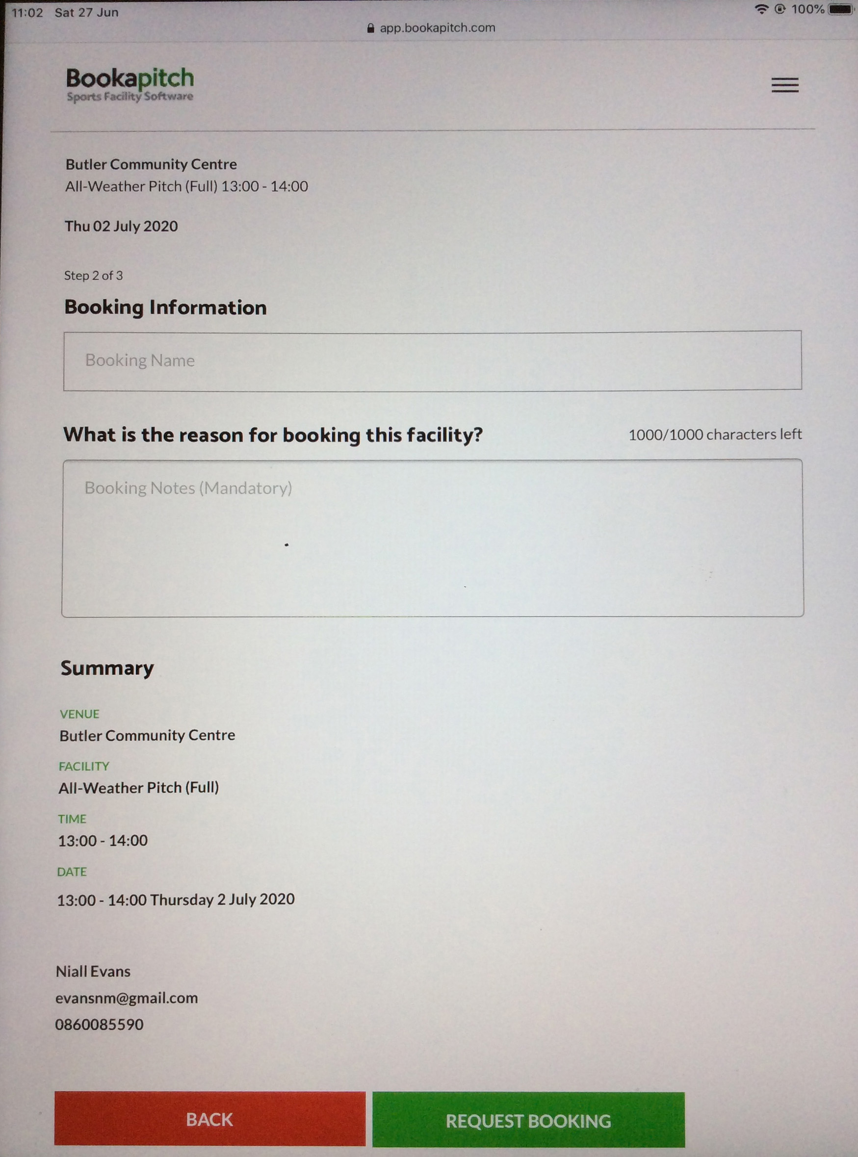 Recheck Summary to right to ensure you are submitting your preferred selection and click "Request Booking" if OK or "Back" to edit selection.