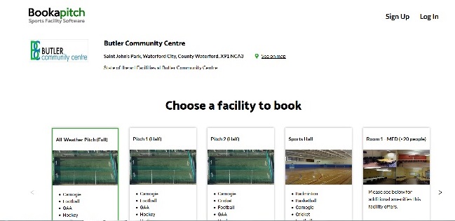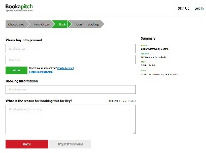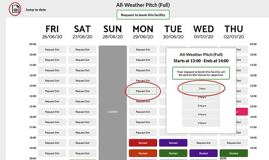 The Availability and Booking Request link will bring you to this page. Select Facility option to Book (All-Weather Pitch Full is the default option; green outline); select your preference. Your selection should now have the green outline. Use Scroll arrows to scroll across to view all options. |