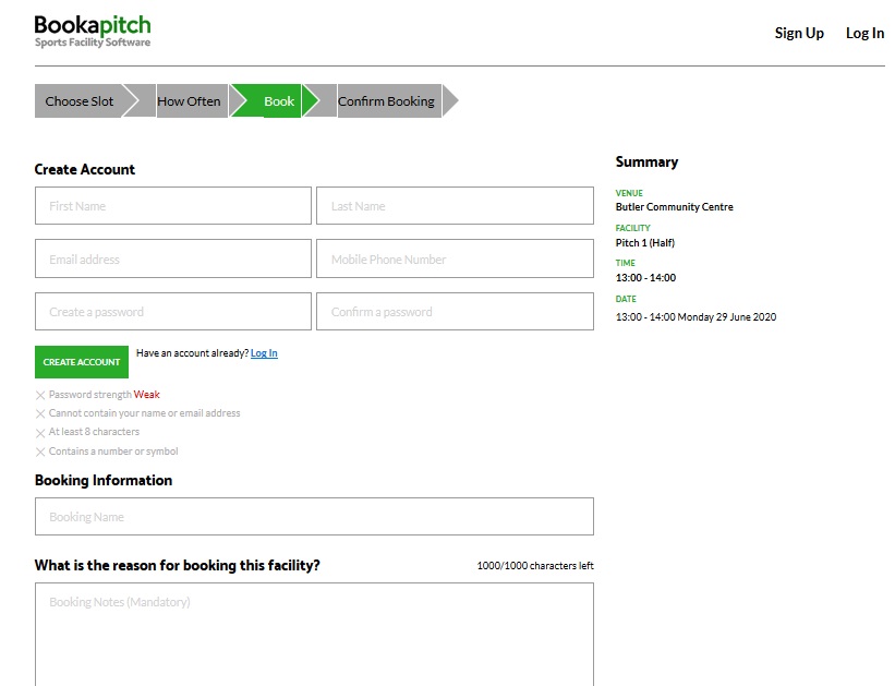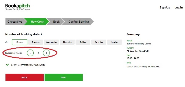 View summary to right to ensure correct selection; if incorrect select back. If you are requesting more than 1 day in the same week select each day required (same time slot will apply). Select the number of weeks required for booking; the same time slot & days will apply to all weeks.